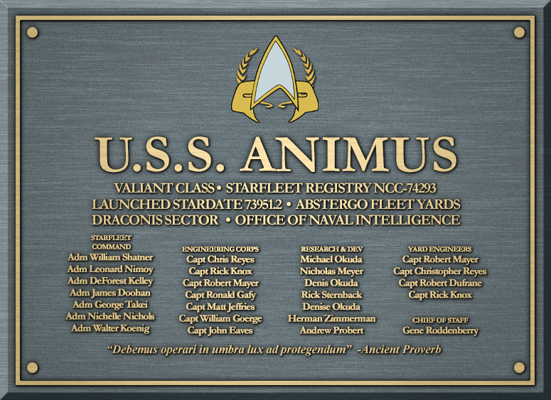 The Logo of the USS Animus shares a lot of common themes with other ships emblems. Sitting in the forefront is a Valiant Class starship, for which the Animus was commissioned into Starfleet as, under which is a stylised Assassin’s Creed Starfleet Delta, hinting at the original history of the group.